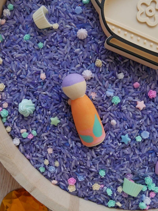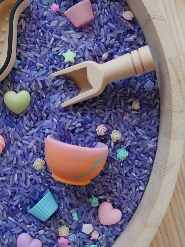 ° Environ 700g de riz coloré (colorants alimentaires et vinaigre blanc) et amélioré par des petits éléments en lien avec le thème du pack,