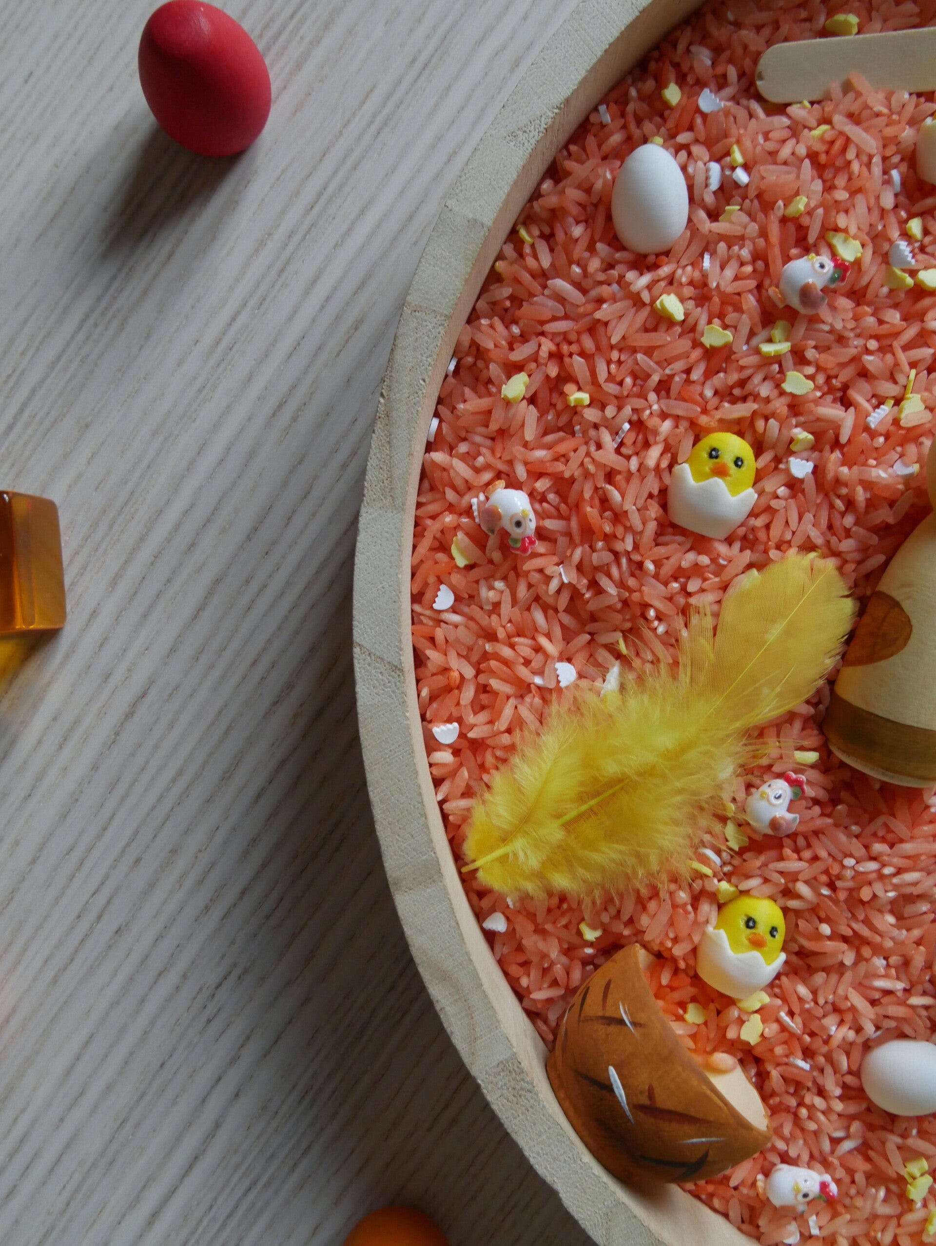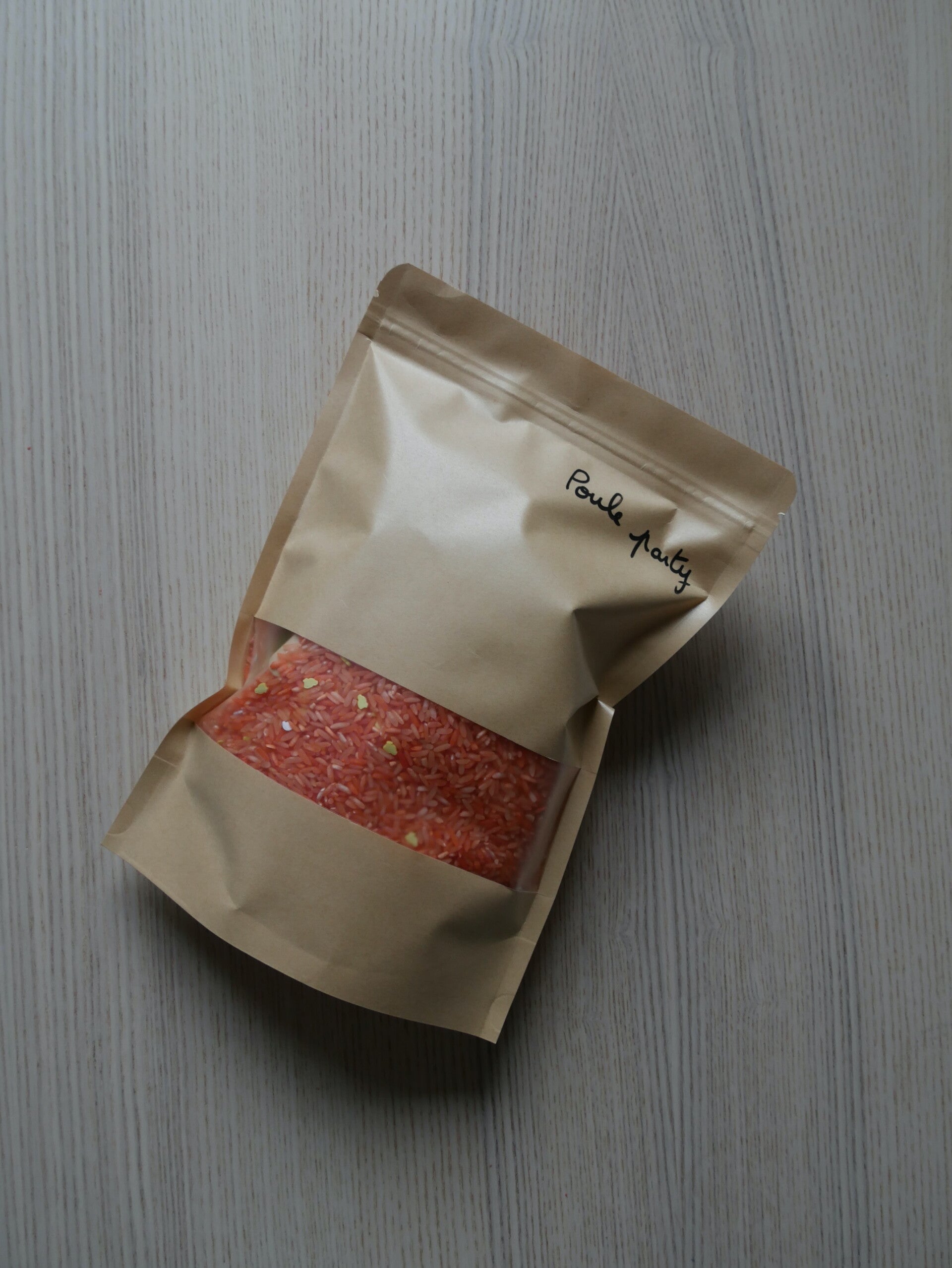 ° Environ 700g de riz coloré (colorants alimentaires et vinaigre blanc) et amélioré par des petits éléments en lien avec le thème du pack,