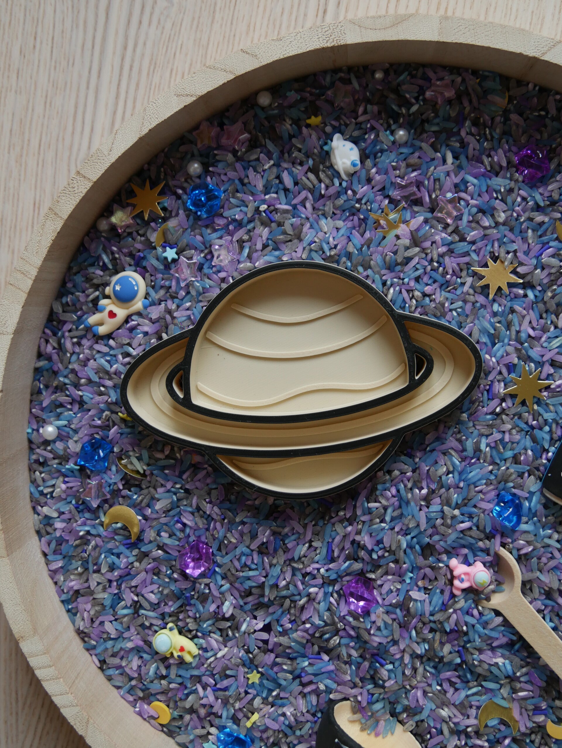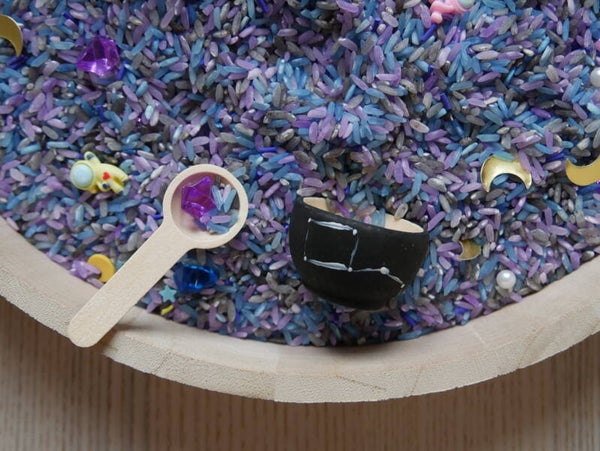 ° Environ 700g de riz coloré (colorants alimentaires et vinaigre blanc) et amélioré par des petits éléments en lien avec le thème du pack,