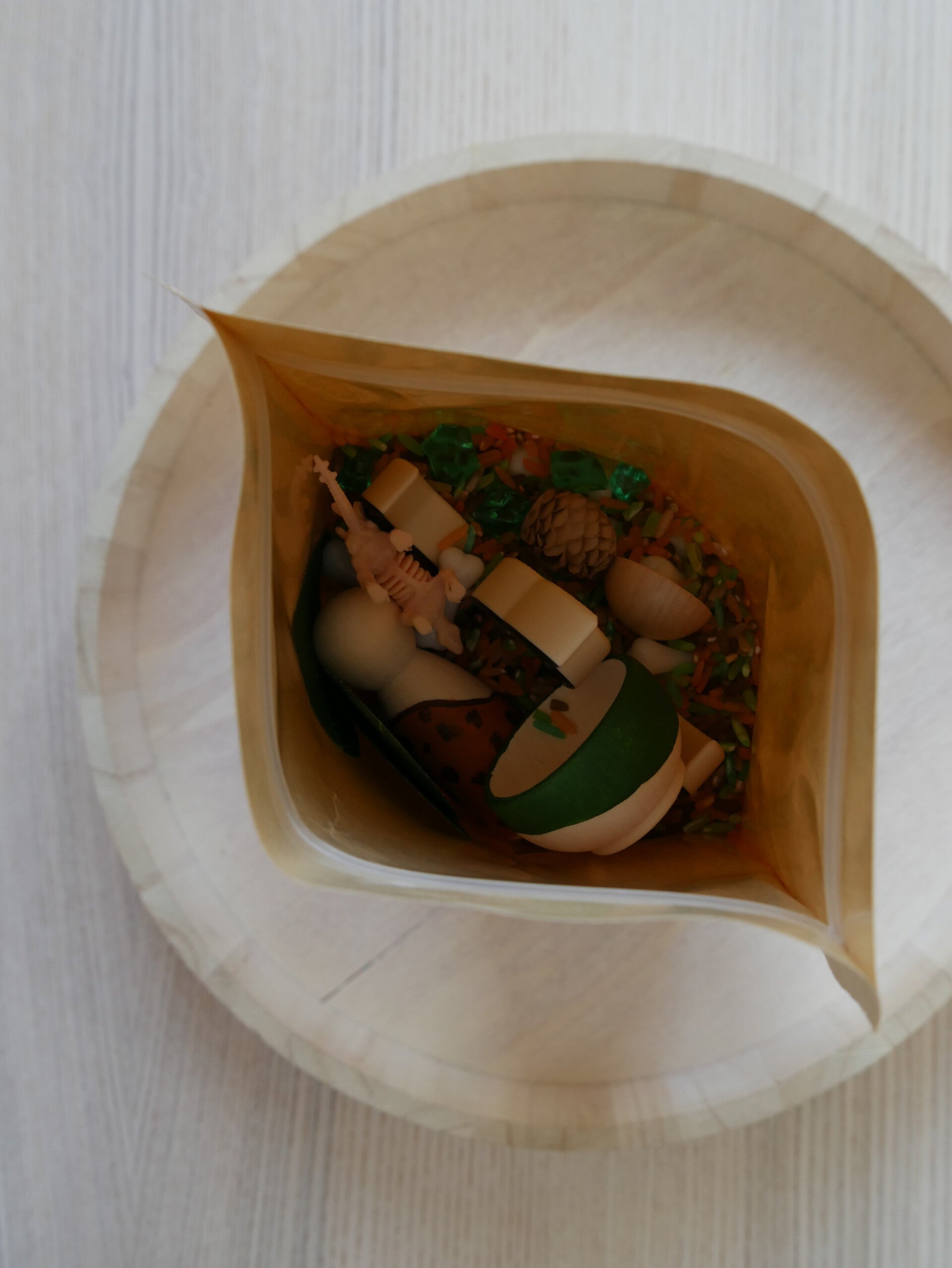 ° Un ensemble de petits objets en lien avec le thème du pack : 2 oeufs de dinosaure, 1 squelette, 3 feuilles, 10 os, 5 diamants verts