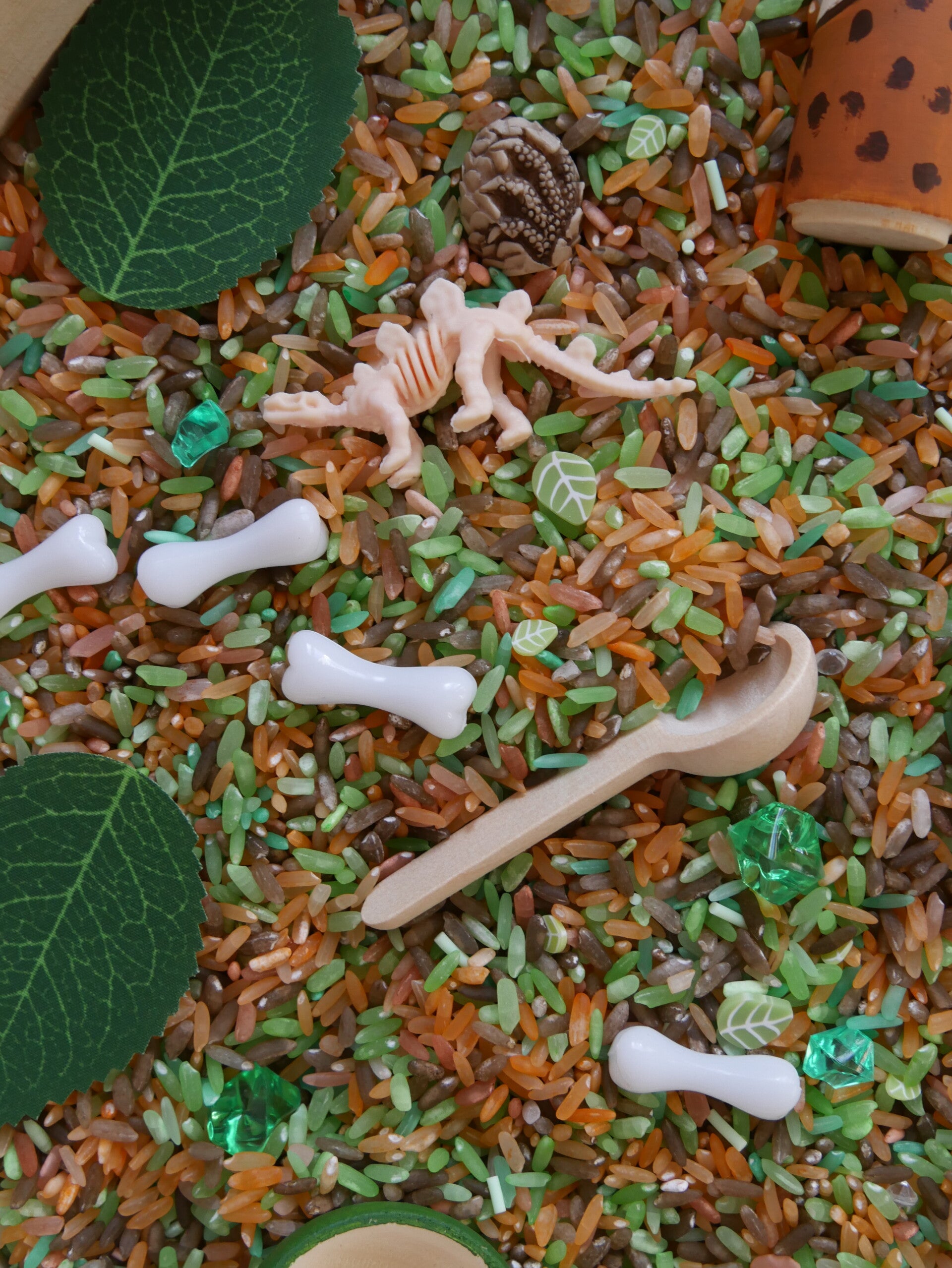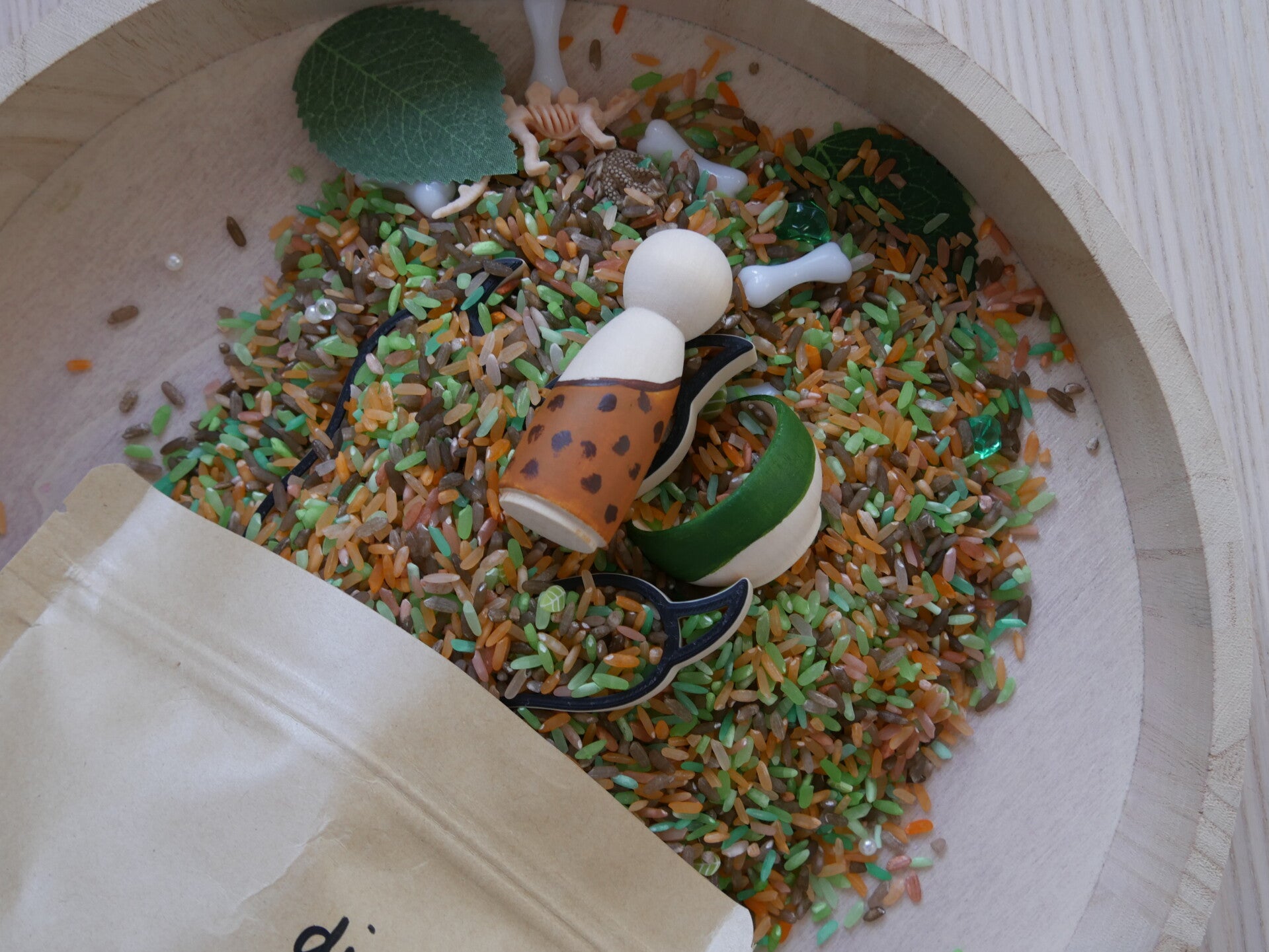 ° Environ 700g de riz coloré (colorants alimentaires et vinaigre blanc) et amélioré par des petits éléments en lien avec le thème du pack,