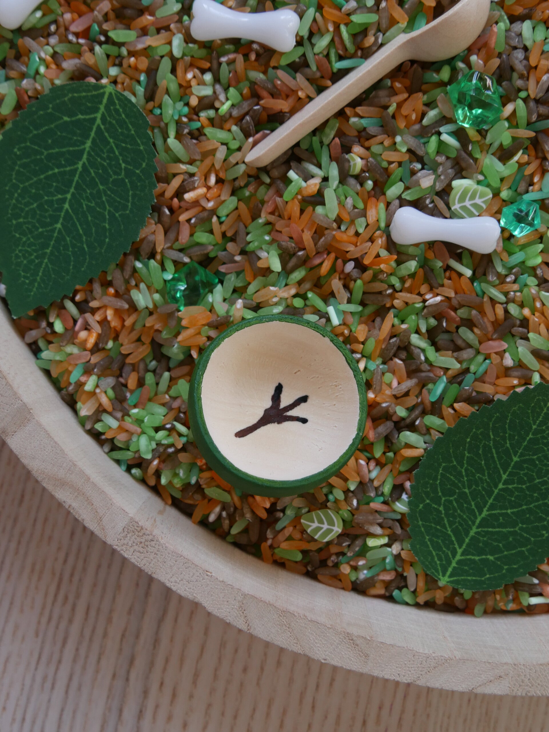 ° Une figurine et un bol, en bois, peints à la main par nos soins avec une peinture non toxique certifiée aux normes EN 71-3 ,