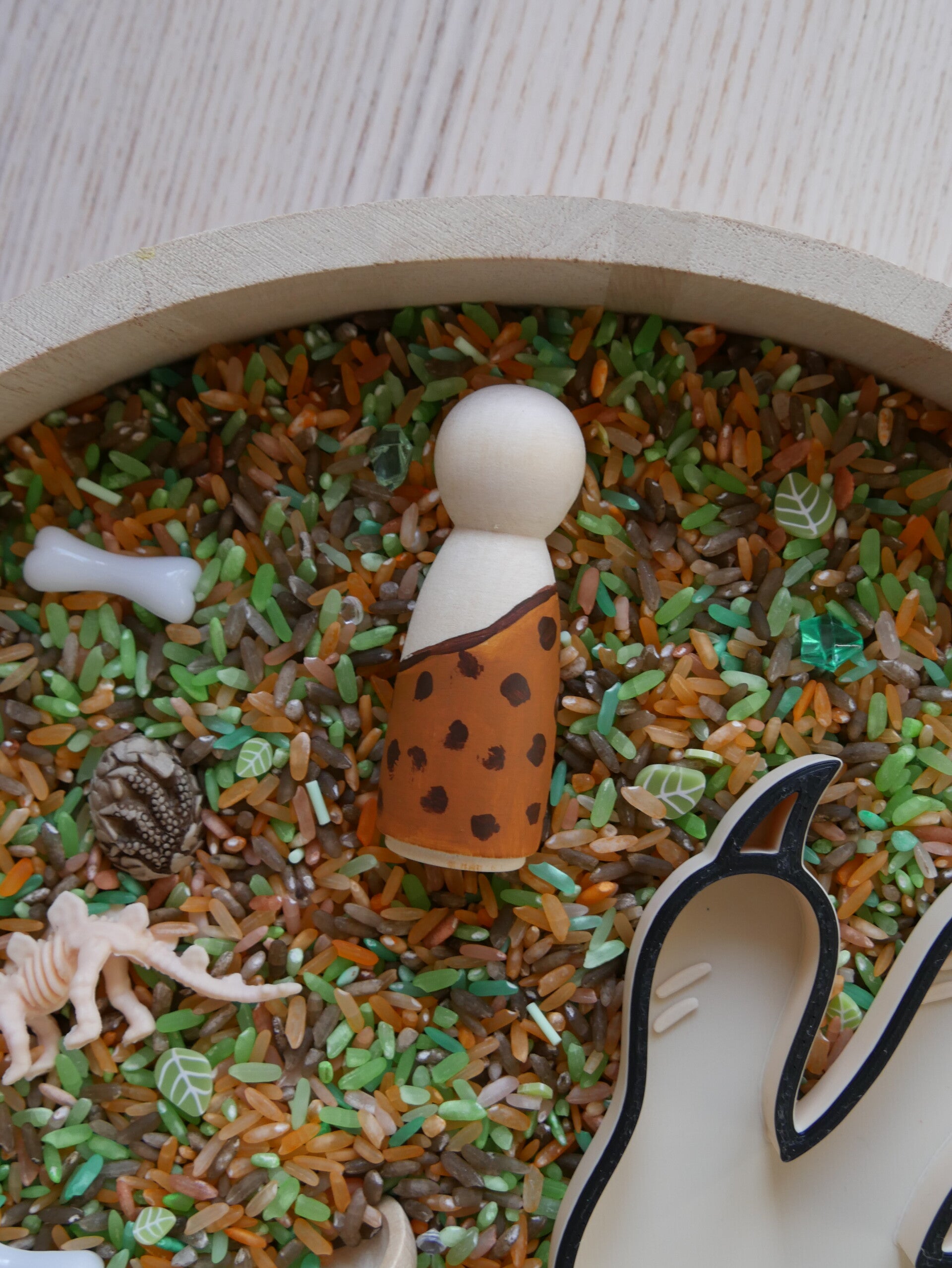 ° Une figurine et un bol, en bois, peints à la main par nos soins avec une peinture non toxique certifiée aux normes EN 71-3 , la figurine est recto / verso,